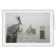 Un grupo de pelícanos mira encendido mientras que un barco del camarón le hace salida en la niebla.