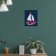 Barco de vela blanco y rojo sobre un fondo azul de anclas de baldosas. Muro de arte náutico para casa.