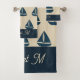 toalla de baño casero monograma y barco de vela azul marino y monograma Beige Coastal. Este sofisticado diseño de velero combina minimalismo costero con un toque personal, con un monograma de personalizable. Los tonos marina y beige crean una relajante estética náutica, perfecta para las casas costeras modernas, las cabañas de playa o los elegantes interiores de inspiración marítima. Es una manera sutil pero significativa de expresar individualidad mientras se mantiene el encanto clásico del océano. Este diseño, generado por IA y que forma parte de una colección de decoración casera que combina personalizables, también me permite ganar comisiones afiliadas mientras comparto la serenidad de la vida costera.