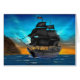 Este barco pirata en el mar se exhibe con una puesta del sol colorida y una vista de la isla del cráneo. Los colectores de barcos piratas o de cualquier nave de podadoras con las velas que gritan encontrarán estas ilustraciones atractivas y finas de la calidad.