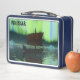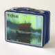 Una imagen un poco estilizada de un buque de larga duración Viking que navega por la noche bajo las luces boreales ahí un par de icebergs; la mayoría de la tripulación está durmiendo. También aparece &cotejo de lectura de texto;VIKINGAR" (Vikings).