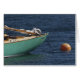 Una imagen de un bote azul-verde y una boya naranja.