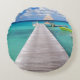 Almohada de tiro redonda con los barcos múltiples en un embarcadero en la laguna clara de la turquesa de una isla tropical en Polinesia francesa en el Océano Pacífico.