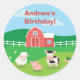 La fiesta de cumpleaños temática de Barnyard, alegre y colorida, favorece al pegatina. Este diseño unisex presenta una escena acogedora para niños, con un granero y personajes lindos como una vaca, cordero y cerdo.