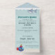 Esta invitación todo en uno con temática de la hora del baño y tarjeta extraíble RSVP cuenta con un patrón de baldosas adornadas con estrellas de mar que se parece a una pared de baño con un borde de bañera blanca y la parte superior de agua rizada que se transforma en un fondo de arena de la manera en que la imaginación de un niño puede convertir lo mundano y cotidiano en una aventura extraordinaria. En la parte superior de esta escena hay un tiburón gris sonriente; un submarino redondo y juguetón con colores primarios; un texto de muestra tipo ondulante en el interior que se puede personalizar para el evento; y un espacio en blanco en el exterior que se puede usar para dirigir las tarjetas al destinatario y la sección que se puede devolver con la dirección de retorno apropiada. No olvide visitar la colección completa de Bath Time Fancy para más regalos y productos de primera necesidad para una ducha o la pequeña de tu vida.
