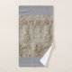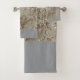 An elegant vintage design covers this bathroom towel set.