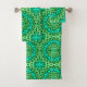 Sistema de la toalla en un diseño inspirado al sudoeste/azteca de la materia textil del batik en un modelo del dial/de la mandala del sol - verde lima y verde esmeralda, acentuados con turquesa/el pavo real