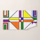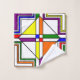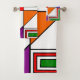 Este conjunto de toallas tiene un diseño Bauhaus de líneas, triángulos, diamantes y cuadrados que hacen un aspecto de cristal manchado en colores primarios y secundarios.