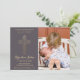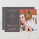 Esta adorable y dulce tarjeta fotográfica de bautismo o bautizo le invita a disfrutar de una delicada cruz floral dorada y de un área para la foto del niño. Una invitación perfecta para tu ocasión religiosa especial, el texto y el color de fondo se pueden personalizar a tu gusto.