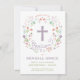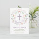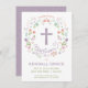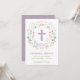 Esta elegante y bonito invitación a bautizar presenta una corona floral ilustrada con la palabra "bautismo" que rodea una cruz. El color del texto, el tipo de letra y el mensaje se pueden cambiar a su gusto. La parte posterior de la invitación tiene un fondo púrpura (que se puede intercambiar a cualquier color de su elección) con un patrón de quatrefoil blanco.