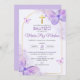 Invite a sus seres queridos al bautizo de su hijo con esta elegante invitación al bautismo. Adorada con lindas mariposas violetas y una cruz, captura la esencia de una ceremonia religiosa católica. Invita a tus series queridos al bautizo de tu hijo con esta elegante invitación. Adornada con lindas mariposas moradas y una cruz, captura la esencia de una ceremonia católica.
