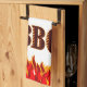 Una toalla de mano leyendo BBQ en un tipo de letra occidental para cocineros y cocineros cocineros. Con arte gráfico de llamas rojas y naranjas en la parte inferior del diseño.