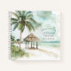 Este cuaderno tiene una imagen acuarela de una palmera y una palapa en una playa tropical con texto que dice Travel Journal.