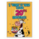 " "Lo reúno" era su vigésimo cumpleaños!" vaca del b-día de la diversión que sostiene una tarjeta de felicitación de la torta de cumpleaños.
