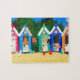 Un rompecabezas con una hilera de coloridas cabañas de playa y gaviotas, de un collage de papel pintado a mano de Judy Adamson. Otros productos y tarjetas de felicitación con este diseño están disponibles en mi tienda.