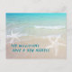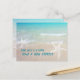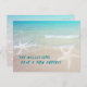 Nueva invitación postal con tema playero. El diseño de mar y arena y de pez estrella con dos plantillas de texto. El agua tropical azul del océano es el fondo de tu texto. En el frente, "Tenemos una nueva dirección" o "Nos/he movido". Incluya los nombres y la dirección de la nueva residencia en la parte posterior. Las estrellas del mar blancas transparentes decoran ambos lados.