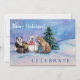 Un oso panda, un oso polar y un oso pardo sostienen regalos de vacaciones a los Navidades en un campo cubierto de nieve con un árbol verde eterno al fondo. El mensaje de la tarjeta de invitación de vacaciones dice "Beberales feriados" y "CELEBRAR". La parte trasera de la tarjeta de invitación tiene los detalles del fiesta de la casa abierta de vacaciones. Personalizar esta tarjeta con todas tus propias opciones personalizadas!