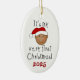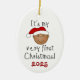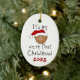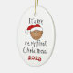 Puedes personalizar la parte de atrás y cambiar la fecha en el primer adorno navideño de este lindo bebé con un bebé afroamericano en un Navidad rojo cargando gorra y un texto de estilo infantil que dice "¡Es mi primera Navidad!".