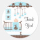 Lindo gracias pegatina del bebé que ofrece un pequeño cuarto dulce del bebé azul con un móvil del bebé. ¡Perfeccione al pegatina para los favores del bebé o los sellos para sobres de la invitación y las invitaciones del nacimiento! Las invitaciones a juego, los sellos y le agradecen observan están disponibles en nuestra tienda en www.celebrateitinvites.com. estudio del ©Cocoa