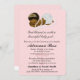 Niña Adorable Baptismo/Invitación a la Cristiandad. Damasco rosa con cruz. Complexión OSCURO BROWN/bebé de piel con pelo afroamericano natural. Vestido en una tiara dorada, con un tutu/flor blanco y adornado con un collar de perlas. Diseño #183. Invitación perfecta para el bautismo/bautismo especial de su bebé.
