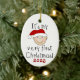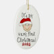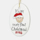 Puedes personalizar la parte de atrás y cambiar la fecha en el primer adorno navideño de este lindo bebé con un bebé con una gorra de Navidad rojo y un texto de estilo infantil que diga "¡Es mi primera Navidad!".