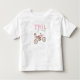 La camiseta está diseñada para una niña de 2 años, tiene una moto de cross rosa brillante y la palabra "Two" está escrita en negrita, con una fuente tipo plantilla. La camiseta es perfecta para que la pequeña la use en su fiesta de cumpleaños, o en citas con amigos y familiares. Le hará sentir especial y traerá una gran sonrisa a la cara de todos.