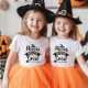 Hocus Pocus Crew T-Shirt presenta tipografía negra con un gorra y escoba de brujas lindas y simples.