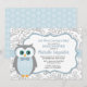 Un adorable tema de los bosques de búho invitación para una ducha de bebé, para un niño en azul y gris con fondo de hoja de color agua y puntos de polka.