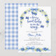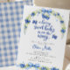 Celebra a tu pequeño con esta encantadora invitación de Baby Shower Berry Sweet que presenta arándanos pintados con acuarela, gingham azul suave y acentos de cinta dulce. Perfecta para un tema de baby shower de arándanos, este diseño es ideal para bebés niños, baby showers de verano y celebraciones inspiradas en frutas.