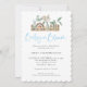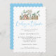 Bebé En Bloom Blue Boho Toys Boy Invitación A La Ducha. Ilustracion estilo Boho de una estantería con plantas y juguetes para bebés y elegante guión informal para el encabezado Baby in Bloom en tipografía azul para el encabezado y coordinando el azul en el otro lado. Puede personalizar fácilmente el resto del texto según sus necesidades y cambiar los colores de fondo si lo desea a través de la opción personalizar.