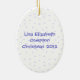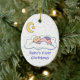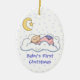 El primer ornamento navideño de una niña dulce hecho de cerámica oval con cinta de bonito. Gráficos de fondo de un punto de polka azul y un bebé dormido, en una nube, con luna creciente encima, y lectura de texto rosa personalizable, Primera Navidad de Baby. En el reverso del adorno está el punto de polka azul, con el nombre y la fecha de lectura de texto rosa. Personaliza todo el texto para la primera Navidad de tu bebé o como un regalo encantador.