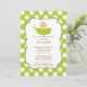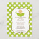 La invitación de Adorable Boy Baby Shower que incluye un lindo bebé en un dulce pod de guisantes colocado en un fondo de polka verde y blanco. Artículos que coinciden disponibles en nuestra tienda. Perfecto para un niño, una niña o una ducha neutra. ©JD Digi Diseños