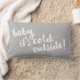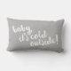 Almohada lumbar gris fresca con el mensaje estacional de una canción preferida del día de fiesta, "bebé, es exterior frío". Tipografía blanca de la escritura con el modelo ondulado de la raya y de punto en ambos lados. ¡Utilice el "personalizar él" para cambiar el gris a un color específico que haga juego su estilo y decoración!