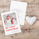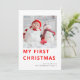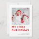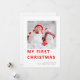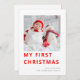 Foto moderna del bebé primero de Navidad. Mi primera Navidad en una moderna tipografía audaz en rojo. Simplemente reemplace la imagen de ejemplo con su propio favorito de formato cuadrado y personalice con su saludo y nombre en la parte inferior y el mensaje en la parte posterior.