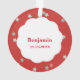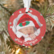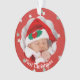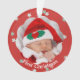 Este adorable ornamento navideño acrílico redondo puede ser personalizado con tu foto en la parte delantera y tu propio texto en la parte delantera y trasera. El marco fotográfico es un Navidad de vieiras rojo acentuado con pequeñas estrellas de invierno para un diseño neutral de género. Gran regalo para los padres de la primera Navidad de un recién nacido.