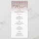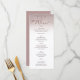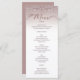 Una elegante carta de menú de bodas diseñada con un refinado fondo beige realzado por un clásico encaje damasco en la parte superior, con detalles decorativos ornamentales, encabezados en mayúsculas y una elegante tipografía, creando un diseño atemporal y formal para una sofisticada recepción de bodas.