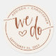 Guión caligráfico escrito a mano con la frase "hacemos" con largos intercambios en los extremos de las letras. Se muestra en el texto de terracota sobre un fondo beige claro. Complementa mi colección de bodas. Personalice la plantilla con sus nombres y fecha de boda. © Kimbellished, LLC