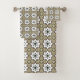 "Two images of decorative towels with geometric floral patterns in beige, white, and black. The first shows hung towels; the second, a folded washcloth."
