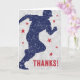 Tema del béisbol Gracias tarjeta con una silueta azul oscuro de un muchacho corriendo rodeado de estrellas rojas en un fondo de bola desgastado. Texto de: ¡Gracias!