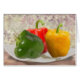 Los pimientos de color verde, amarillo y rojo se sientan en un plato blanco listo para cocinarse. La original es una pintura al óleo en miniatura de Kathie Miller