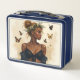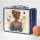 A lo lejos, una impresionante joven adornada con delicadas miradas florales en la corona, rodeada de floridas mariposas doradas. Su elegante conjunto de encaje negro contrasta maravillosamente con su piel brillante, evocando un sentido de gracia natural y misterio. Los tonos cálidos y suaves del fondo dan un toque de fantasía y encanto al lugar.