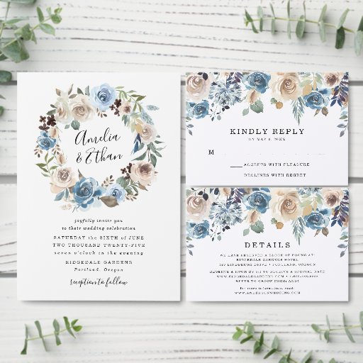 Nuestra elegante y elegante tarjeta de recepción de bodas cuenta con un borde de flores y vegetación de color blanco, beige y azul. Personalice el diseño añadiendo los detalles de la recepción de la boda. Diseñado para coordinar con nuestra colección de bodas de Belleza Blooming.
