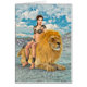 Representación 3D de una hermosa joven y un león en el paisaje desértico