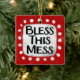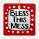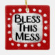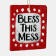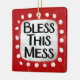 "Bless This Mess" es un lindo diseño de texto en rojo con texto negro, junto con una forma de acento blanco y puntos caprichosos de textura blanca que lo rodean.