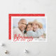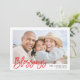 Elegante tarjeta de fotos de vacaciones con la palabra "Bendiciones" en un moderno tipo de letra de guión, marcadores de posición de fotos y texto, y un diseño de puntos moderno rojo y blanco en la parte posterior de la invitación.
