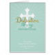 Esta tarjeta de dedicación para un niño pequeño está en un verde neutro para un niño o un chica. Los rayos puntiagudos salen de la cruz blanca con una palabra digital de aspecto dorado que dice Dedicación. Envíe bendiciones al pequeño en su Día de la Dedicación.