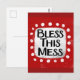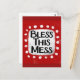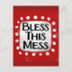 "Bless This Mess" es un lindo diseño de texto en rojo con texto negro, junto con una forma de acento blanco y puntos caprichosos de textura blanca que lo rodean.