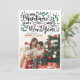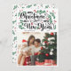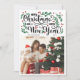 Tarjeta fotográfica tradicional de Navidad con Feliz Navidad y un feliz Año Nuevo en un encantador diseño de letras con una parte de su familia y vegetación y bayas rojas.