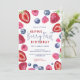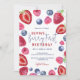 Esta encantadora invitación para una fiesta de cumpleaños incluye la tipografía de personalizable Berry First Birthday con un marco de berry y una invitación para una fiesta de fondo blanca para una niña.