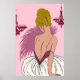 Nuestra hermosa Bianca de pelo rubio, vestida de blanco y rosa. Bianca está adornada con joyas y tiene un polvoriento ventilador de plumas rosa. Las lámparas de araña de Borgoña con fondo rosa claro.